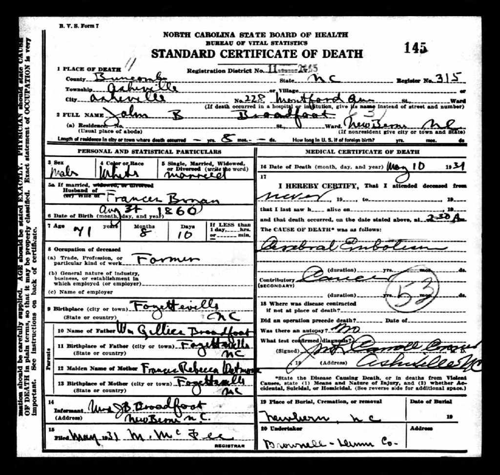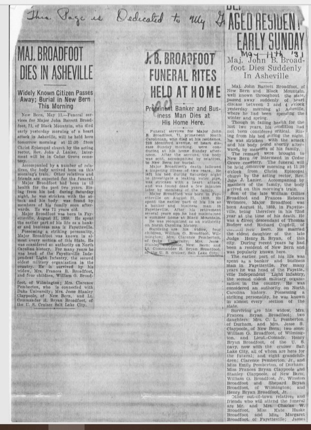 When Major John Barrett Broadfoot was born on August 31, 1860, in Fayetteville, North Carolina, his father, William, was 54 and his mother, Frances, was 35. He married Sarah Frances Bryan (1862-1950) on October 15, 1885, in New Bern, North Carolina. They had four children during their marriage: Mary Norcott, 1866-1972, William Gillies, 1887-1961, Frances Bryan, 1890-1960, and Henry Bryan, 1893-1980.